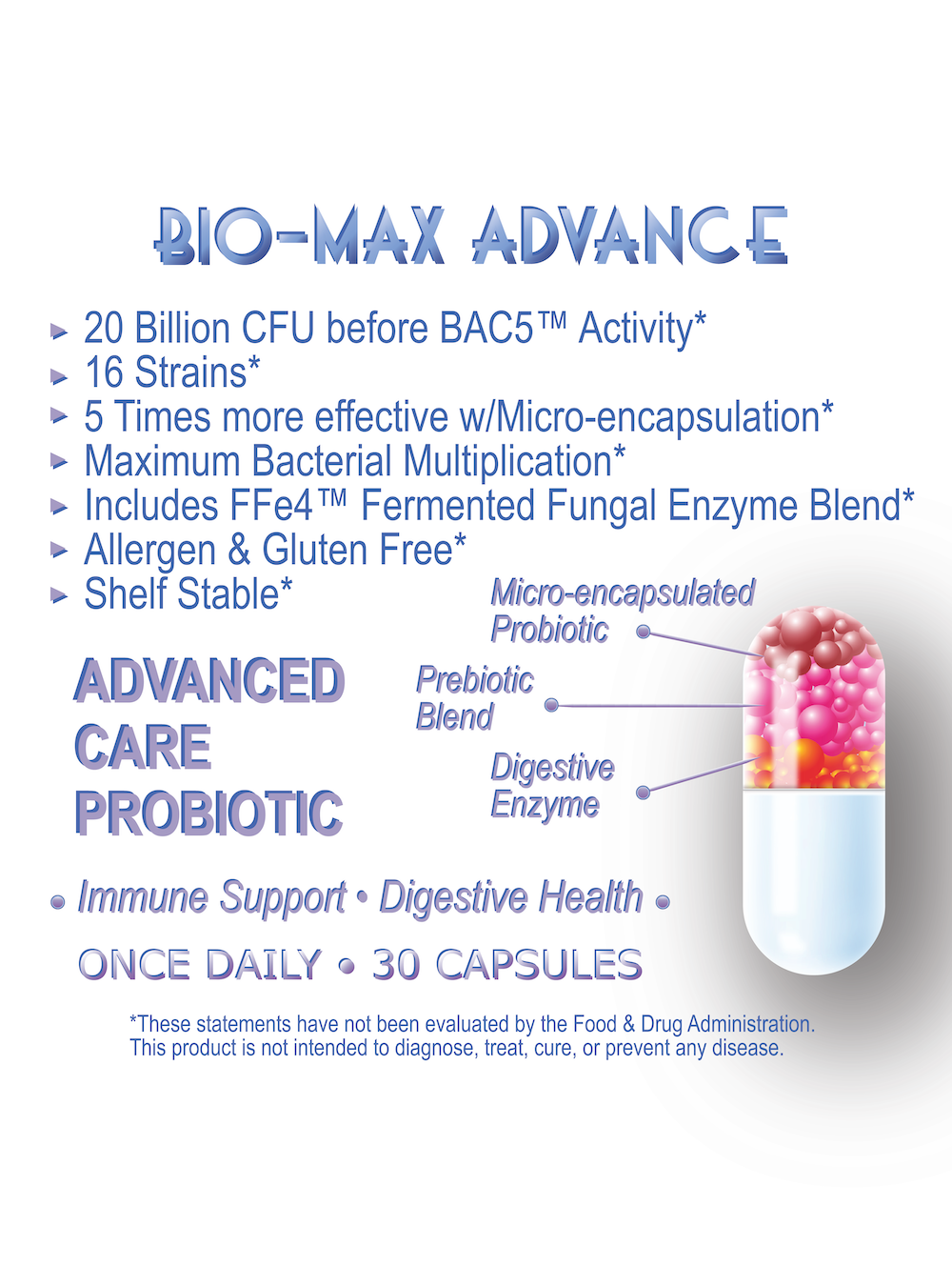 BIO-MAX ADVANCE featuring Bac5â„¢ is our maximum strength solution for those who may need a higher CFU count. Also recommended during, and after any course of antibiotics, or to address specific digestive and immune issues.